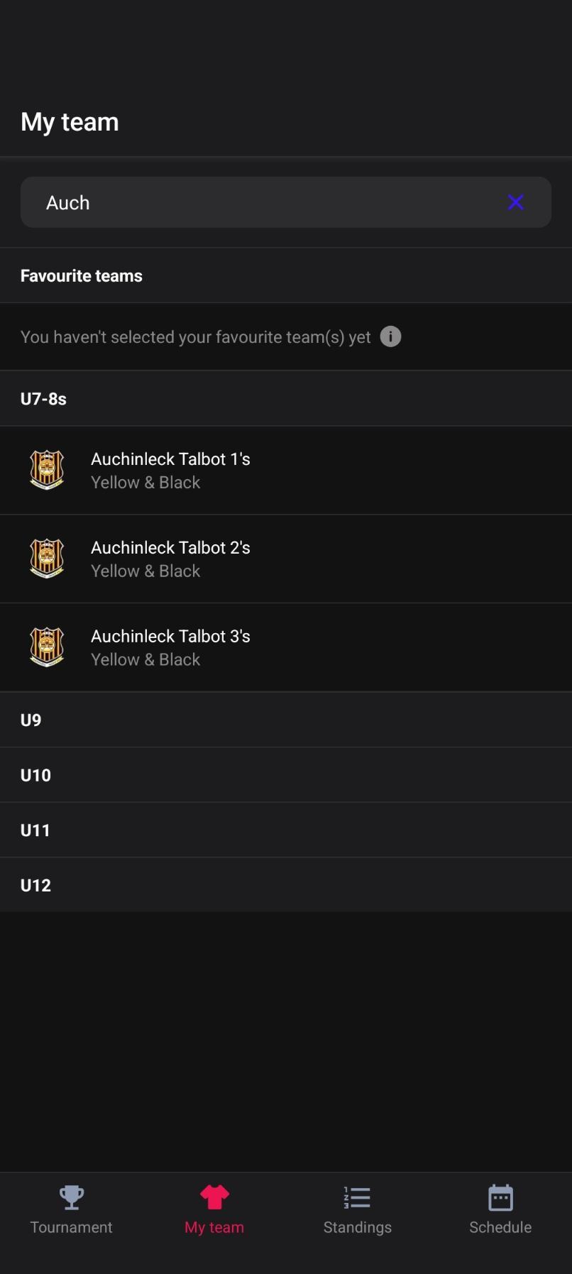 To find your team, select ‘My Team’ at the bottom of the screen. Search your team in the search bar and add it to your favourites. This will ensure you receive a reminder notification 15 minutes before your team is due to play a match.