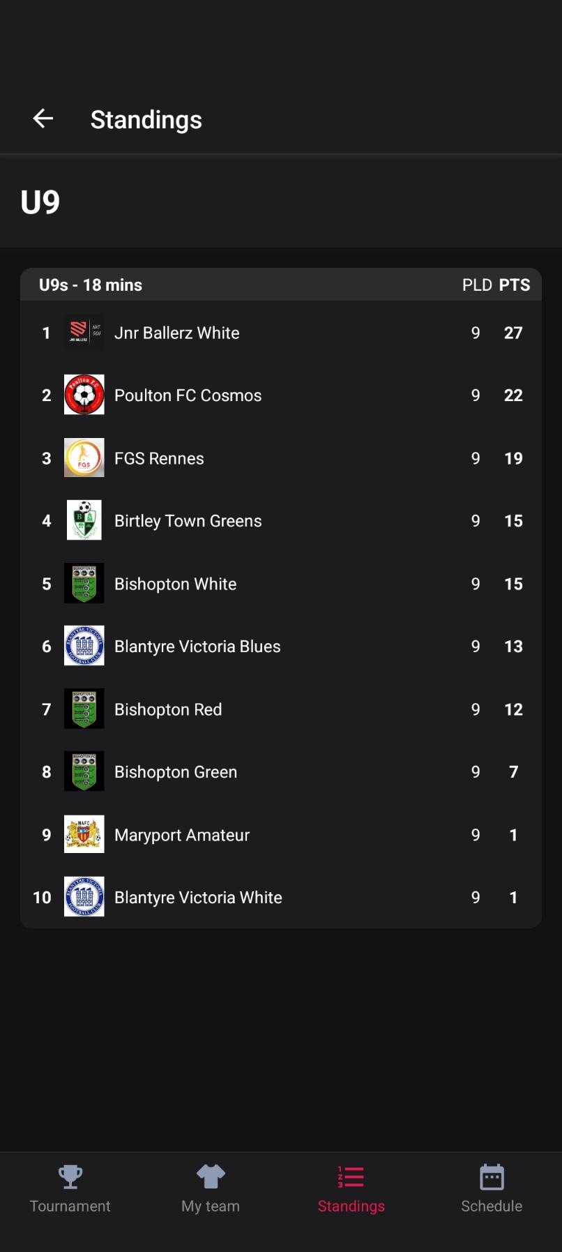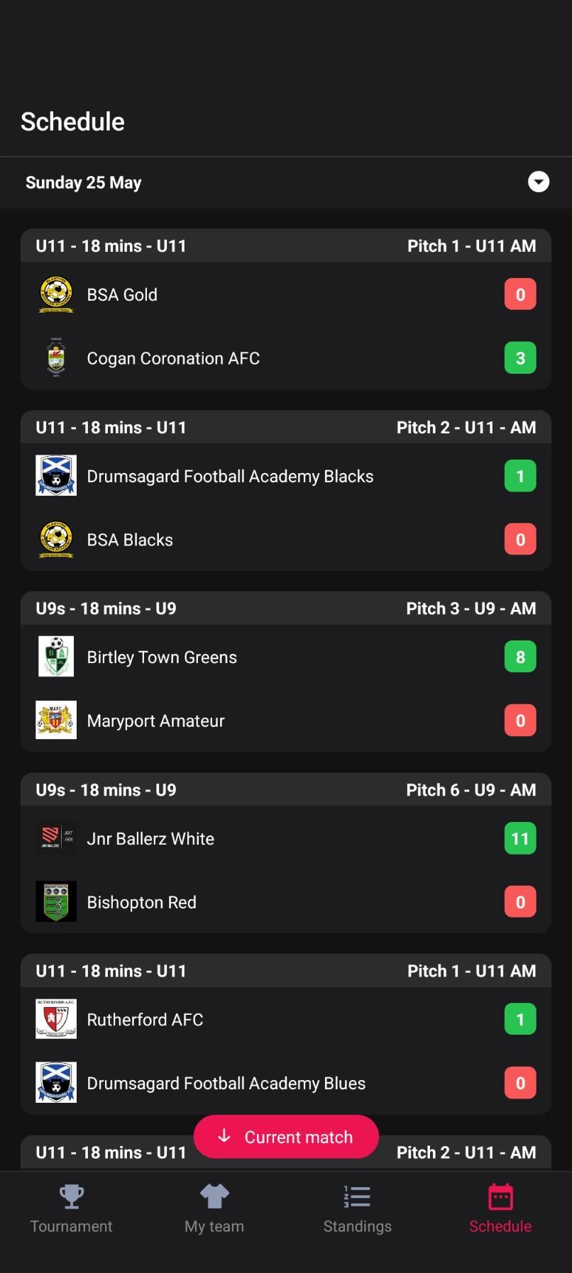 After you have selected your team and added them to your favourites, you can check the standings – simply head to the ‘Standings’ tab at the bottom of the page! There, you can select the age category that you wish to look at! On this screen you can see the standings for both days, so ensure that you have selected the relevant one.